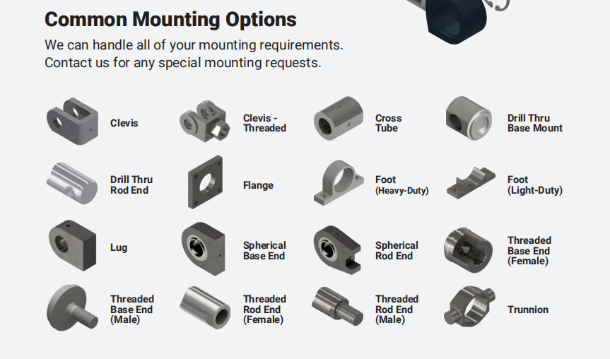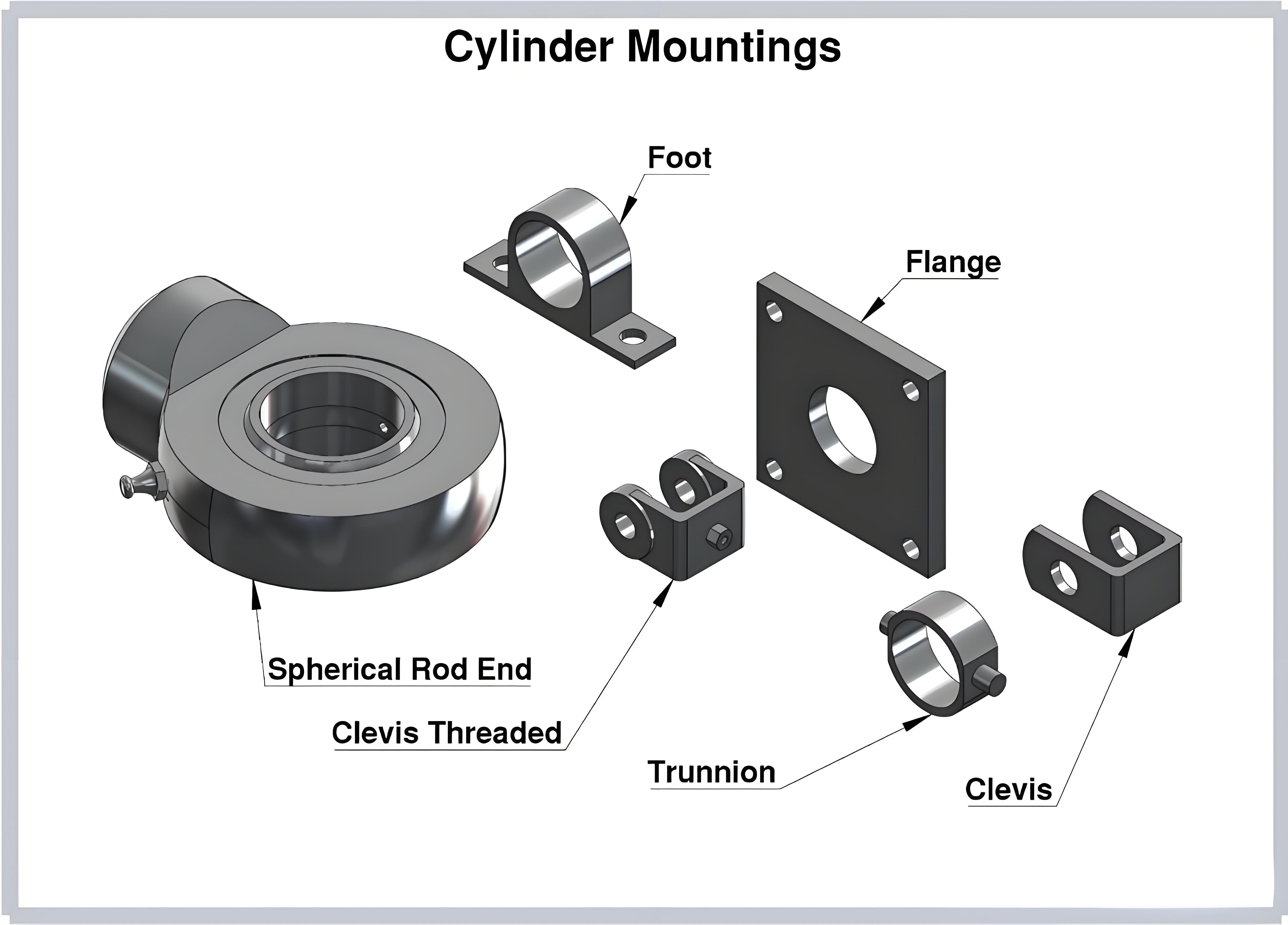 Clevis mounting is a versatile option for applications requiring moderate pivoting capability. It involves attaching a clevis—a U-shaped bracket— to either the cylinder’s cap end or rod end. A pin passes through the clevis and a fixed yoke, allowing the cylinder to rotate around the pin. This method is simpler and more cost-effective than trunnion mounting, making it suitable for smaller cylinders in applications like door actuators, material handling equipment, and light-duty machinery. However, the clevis and pin are subject to shear forces, so it is crucial to select components with sufficient strength for the application’s load requirements. Additionally, the pin must be secured with a cotter pin or locknut to prevent accidental disassembly.