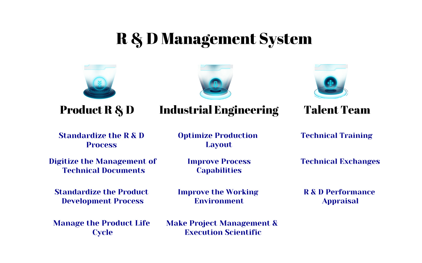 Product R & D: Standardize the R & D process, digitize the management of technical documents, standardize the product development process, and manage the product life cycle.
